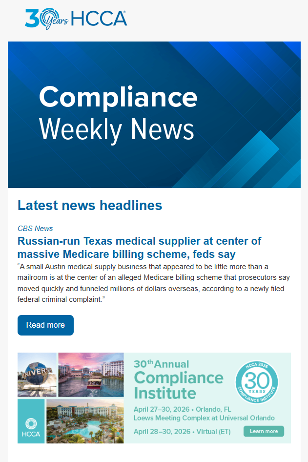 Subscribe to HCCA’s Compliance Weekly News